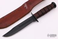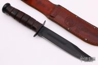This KA-BAR USMC Fighting Knife has a carbon steel black clip point blade, marked "KA-BAR/ Olean, N.Y. USMC", and steel double guard. Blade stock is .174", depth 1.233". Handle is stacked leather with a 3/8" pinned butt cap. Has some scuffs and scratches, has been sharpened, otherwise good condition. Includes original brown leather sheath with belt loop.