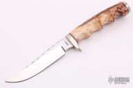 This hunter by Harold Corby features a mirror polished blade with fileworked spine, .202" and .986" depth, hidden tang construction. The handle has a nickel silver guard and butt, stag grip with finger grooves and red/white/black spacers. Has a couple of small stains on the blade, otherwise excellent condition.