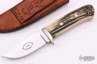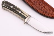 This Hunter by Charles Clifton features a mirror polished blade with .196" blade stock and 1.165" blade depth, full tapered tang construction. The handle has a nickel silver guard and stag scales with red liners. Comes with a hand tooled brown leather sheath. Has a couple light stains on the blade, otherwise excellent condition.