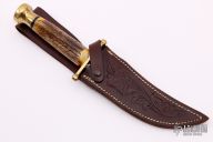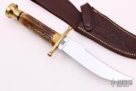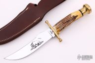 This Kodiak Bowie from Case Knives features an upswept mirror polished blade with false top edge. Kodiak Bear Etching on presentation side. The handle is comprised of brass double guard and pommel with stag handle over hidden tang construction. Includes original hand tooled brown leather sheath with belt loop.