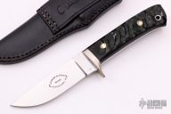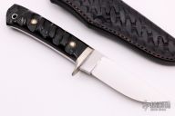 This Hunter by Charles Clifton features a mirror polished blade with .183" blade stock and 1.035" blade depth, full tapered tang construction. The handle has a nickel silver guard and kudu horn scales with black liners. Comes with a hand tooled black leather sheath. Excellent condition.