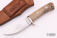 This Hunter by Charles Clifton features a mirror polished blade with .186" blade stock and 1.141" blade depth, full tapered tang construction. The handle has a nickel silver guard and oosic scales with black liners. Comes with a hand tooled brown leather sheath. Has a couple light stains on the blade, otherwise excellent condition.