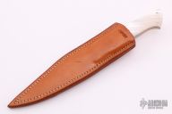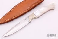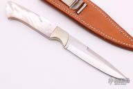 This boot knife by Harold Corby features a mirror polished blade with sharpened top edge, .115" and .850" depth, full tapered tang construction. The handle has nickel silver bolsters and mother of pearl scales with red liners. Comes with a brown leather boot sheath. Excellent condition.