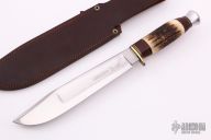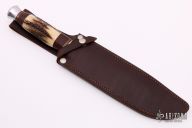 This Bowie Knife by J Nowill & Sons features a mirror polished blade with fullers, .230" blade stock and 1.472" blade depth, hidden tang construction. The hand has a brass guard and aluminum butt with stacked leather and stag grip. Comes with a brown leather sheath. Has some light stains on the blade, otherwise excellent condition.