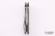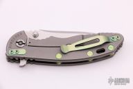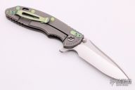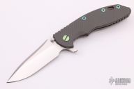This 3.5" XM-18 from Hinderer Knives has been reground by Will Moon, satin finished spear point blade. Grey G-10 scale and a bead blasted titanium frame with anodized titanium hardware. Dual thumb studs and notched flipper and thumbrest. Reversible titanium pocket clip, titanium over travel stop. Strong lock up, action, nice detent and blade seating is center. Excellent condition. Comes with a zippered case.