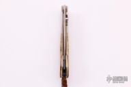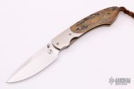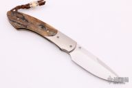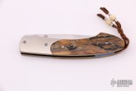 This B-12 by William Henry features a  hand rub satin finished blade with single thumbstud. The handle has satin finished titanium bolsters, mammoth ivory scales, anodized titanium liners and backspacer, lanyard with mammoth ivory beads. Comes with original box, sheath and COA. Excellent condition.