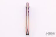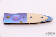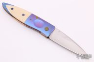 This Linerlock by Michael Walker features a hand rub satin finished blade with a single fileworked and anodized titanium thumbstud. The handle has anodized and dovetailed titanium bolsters with a clever milling pattern and contouring, mammoth ivory scales, anodized titanium liners. Nice lockup, detent and blade seating. Comes with a Velvet pouch. A-Side of the blade is marked "by ML Walker" you likely won't be able to see it in the pictures. Has a few light scratches, otherwise excellent condition.