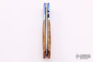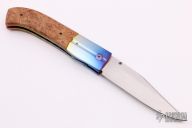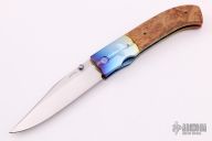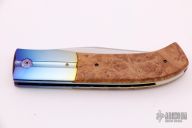 This PreTac Emerson Linerlock features a hand rub satin finished blade with false top edge, single anodized titanium thumbstud. The handle has dovetailed and anodized titanium bolsters, burl wood scales, anodized and polished titanium liners, polished aluminum backspacer. Nice lockup and blade seating. Excellent condition. These are hard to come by. Beautiful knife.