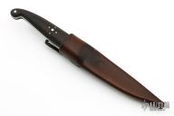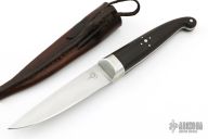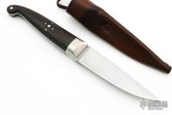 This knife by Paul Cooper features a satin finished blade with .124" blade stock and .952" blade depth, full tang construction. The handle has a cast silver guard with ebony scales and nickel silver pins. Comes with a brown leather sheath. New from maker.