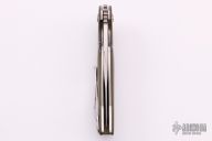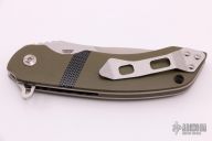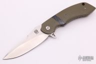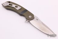 This custom Mike Vagnino designed flipper features a satin finished blade with notched thumbrest and a flipper. The handle has green G-10 scales with black C-Tek insert, satin titanium liners, green G-10 backspacer, tip up tumbled stainless steel clip. Great action that requires no wrist movement. Nice detent, lockup and blade seating. W818 inside backspacer. Comes with a zippered case.  Excellent condition.