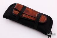This knife by Wendell Fox features a hand forged, hand rub satin finished blade with a hamon and fileworked spine and tang. The handle has dovetailed and polished stainless steel bolsters, black G-10 scales, fileworked brass liners, nickel silver latch. Has some scratches, otherwise good condition. Comes with a zippered case. Comes with a brown leather belt sheath.