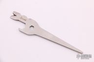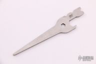 "Made of Crucible's CPM 3V premium tool steel this intriguing pocket tool features a pry tip with wire stripper notch, a 1/4" hex opening, a bottle opener that doubles as a 7/16" wrench and a tapered alignment tool." Tumble finish. Excellent condition. Comes with original bag and card.