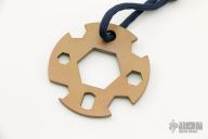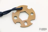 "Made of titanium, this pocket disc tool is loosely based on an antique lantern wrench design from the 1940s. Features include 1/4 and 5/16 hex openings, 3/8, 7/16, 1/2 inch wrenches, O2 cylinder wrench and 5/16 open end wrench/bottle opener." Anodized 6AL4V titanium. Excellent condition. Comes with original bag and card.