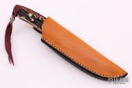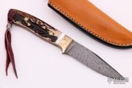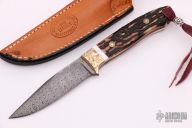 This Knife from Mr. Pease features a Damascus blade with .156" blade stock and .855" blade depth, mortise/frame tang construction. The handle has mokume bolsters, stag scales with mosaic pins, mother-of-pearl spacers and a brown canvas micarta frame. This piece is new from Mr. Pease and comes in custom leather sheath by TFC Leather.