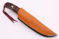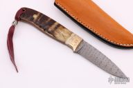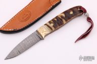 This Knife from Mr. Pease features a Damascus blade with .149" blade stock and .826" blade depth, mortise/frame tang construction. The handle has mokume bolsters, big horn sheep scales with mosaic pins, mammoth tooth spacers and a brown canvas micarta frame. This piece is new from Mr. Pease and comes in custom leather sheath by TFC Leather.