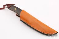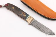 This Knife from Mr. Pease features a Damascus blade with .147" blade stock and .833" blade depth, mortise/frame tang construction. The handle has mokume bolsters, mammoth ivory scales with mosaic pins, abalone spacers and a brown canvas micarta frame. This piece is new from Mr. Pease and comes in custom leather sheath by TFC Leather.