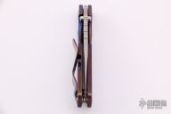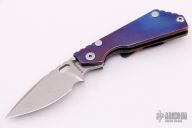 This PT by Mick Strider features a stonewashed blade with notched thumbrest and thumbhole. The handle has an orange peel finished and anodized titanium frame with matching tip up clip. Has a couple scratches on the clip, otherwise excellent condition.