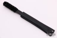 In 1988, he began making specialized knives for use by the military. This turned out to be fortunate turn of events, both for Mick and for the knife using world at large. Mick’s approach was to not get burdened by the weight of past designs. He started with a tabula rasa, a clean slate, informed only by his own experiences and knowledge of what a soldier needed in a knife. The knives he made didn’t look like the hunter-inspired knives seen in most PXs; instead they were almost brutish in their functionality: beefy, solid, and with unbreakable ¼” stock full tangs. These knives were the first indication of his innovative approach: in addition to their utilitarian design, the knives carried a subdued finish and subdued sheaths. No one carrying a Strider knife was going to be spotted because of sunlight glinting off of polished steel or a glossy leather sheath. Soldiers, policemen, and other men going into harm’s way couldn’t buy them fast enough. Mick sampled some good ideas, but made them great. For instance, he was not the first to wrap a knife handle with paracord, but he was the first to do it in a way that was tough enough for sustained infantry use. His knife line grew over the following years to include different varieties of fixed blades, all distinctive and many with specialized uses. But constant in all of them was a disregard for convention, and a desire to try new ideas. An example of this was the Ajax – it featured a very wide blade surface clearly designed to inflict damage. It drew on the weapons carried by Roman legionnaires, yet was modern and usable in the 21stCentury battlefield. Mick also worked on his technical skills, always striving to become better at the physical craft. At the 2002 Blade Show, a group of the best tactical knifemakers in the country decided to compete with each other to produce the most innovative and interesting fixed “battle blade” at the show. Mick’s entry, an incredible integral knife made out of ½” titanium stock with a zippered composite blade, gorgeous handles, and integral guard was the unanimous winner, and effectively retired the competition.