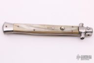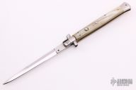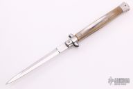 This Swivel Bolster from Stiletto Italy features a mirror finished dagger ground blade with false top edge. The handle is comprised of stainless steel bolsters and pommel with honey horn scales over brass liners and stainless steel backspacer. Excellent condition.