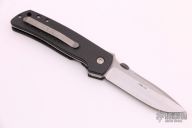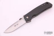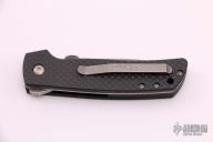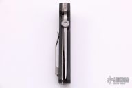This Mid-Tech by Bob Terzuola features a spear point blade with notched thumbrest and flipper and a thumb disc. The handle has carbon fiber scales, a tumble finished titanium liner, black G-10 backspacer and tip up titanium clip. Comes with nylon zippered case.  #077 inside frame.  Light oxidation is visible on the blade otherwise the knife is in excellent condition.