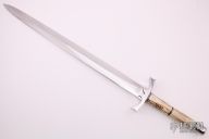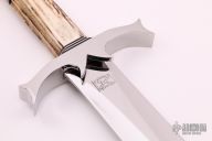 This Medieval Sword by Walter Brend features a double-edged mirror polished blade with .238" blade stock and 1.990" blade depth, hidden tang construction. The handle has a mirror polished stainless steel guard and butt with two-piece stag grip with black/stainless steel spacers. Comes with a hard case. Has a few light scratches, otherwise excellent condition. This has to be one of a kind.
