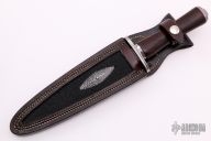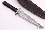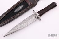 This Dagger (please let us know if you know who made this, mark is "RG") features a double edged Damascus blade with .224" blade stock and 1.444" blade depth, hidden tang construction. The handle has a fluted stainless steel guard and butt with a cocobolo grip. Comes with a brown leather sheath with stingray skin inlay. Excellent condition.