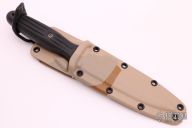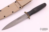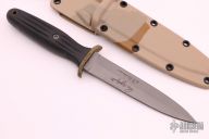 This Applegate/Fairbairn Combat Fighting knife is a serialized version made by Bill William W Harsey, it is #2046, he started this run with 154cm at s/n 1000. It features a hand ground bead blasted double edged blade, .183" blade stock and 1.101" blade depth, hidden tang construction. The handle has a brass guard with a black lexan handle. Comes with a camo kydexsheath. "William W. Harsey Maker" on b-side of blade dated May 31st, 2004. Has a couple light scuffs, otherwise excellent condition.