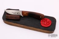 The Makers Knife with Makers Mark Bourbon Barrel Handles Limited Edition is the newest creation from Nicholas Nichols Custom Knives. This knife was made from a genuine Makers Mark Bourbon Barrel. Nic then took it a step further and made a stand out of the left over Bourbon Barrel pieces, touching it off with a wax seal of his Knife Makers logo.   This is a limited edition with 2 prototypes made and 45 serialized final knives. Included with the Makers knife is a custom leather pocket style sheath. This is a stunning knife that will happily handle everyday task, hard use, or look fantastic displayed with your Bourbon or Knife collection. Comes with Markers Mark Barrel stand as well. Excellent condition.