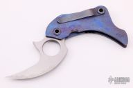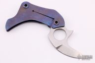 This Rhino by Warren Thomas features a satin finished chisel ground blade with carbidized edge and thumb hole. The handle has a "fingerprint" anodized titanium frame with a matching clip, tip up carry. Nice detent, lockup and blade seating. Excellent condition.