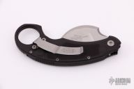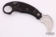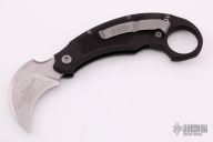This Iconic Auto has a black handle and a stonewashed blade. Designed after the Iconic Karambit fixed blade, the Iconic Auto, made in collaboration with Bastinelli Creations, is a must-have innovative tactical knife. Most automatic knives open from a push button near the pivot, but the button on the Iconic is near the finger hole. Once you've de-activated the safety, you can open the blade with a button near the finger hole. Features: Premium stainless steel blade is tough and will hold it's edge. Unique push button action allows for a reverse grip during deployment. Finger hole allows for a secure and unbreakable grip. Comes with original box and papers. S/N 145 and dated 12/2019. Excellent condition.