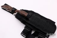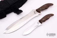 This Prototype David and Goliath set is the largest combat knife Mercworx has made to date. The blade is cut from S30V steel and then hand ground with the traditional Mercworx double recurve. Hand rub satin finished blades with sharpened top edges, notched thumb rests. .241" blade stock on Goliath and .184" blade stock on David. Full tang construction. Brown canvas micarta scales with hollow tube pins. Comes with black nylon sheaths for both knives that fit together or can be worn separately. Has a few light scratches, excellent condition.