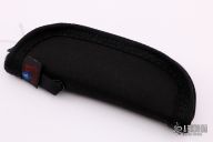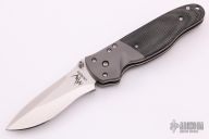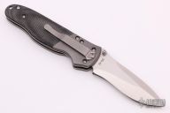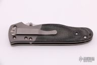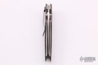 This Lachesis from Mercworx knives features a hand rub satin finished recurve drop point BG-42 blade with swedge, dual thumbstuds and notched thumb rest. The handle is comprised of bead blasted and dovetailed titanium bolsters, black canvas micarta scales over titanium liners and barrel spacers. Stainless steel tip down clip. Has a few light scuffs, otherwise excellent condition. Comes with zippered case