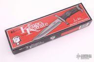 This UC950 Kenpo Karate Knife by United Cutlery features a double brass guard and pommel with a dymondwood grip. Blade is .190" thick and 1.505" deep. Satin finished blade with false tope dge. Hidden tang construction. Includes a brown leather sheath and original box and lapel pin. Designed by Gil Hibben. Excellent condition.
