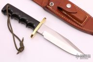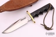 This Model 15 Airman by Randall Made Knives features a clip point blade with a sharpened top edge, .234" stock. 1.300" blade depth. Sharpened top edge, full tang construction. The handle has black linen micarta handle with finger grips and a brass guard. The Model 15 is designed especially for heavy-duty use and to be as nearly indestructible as possible. Comes with a brown leather sheath. Excellent condition.