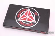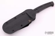 This Massad Ayoob "Razorback" by Masters of Defense has a black coated tanto partially serrated blade with fullers, .177" blade stock and .637" blade depth, hidden tang construction. The handle is black coated aluminum. Comes with a black kydex sheath. Has some scuffs/scratches, has been resharpened, otherwise good condition. Comes with original box, sheath and papers.