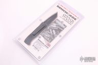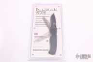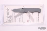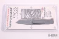 The 970SBK is the Benchmade version of the Emerson CQC7 folder. It has a black chisel ground partially serrated blade with notched thumbrest and a thumbdisc. The handle has black G-10 scales, titanium liners, black backspacer, lanyard hole, tip down black stainless clip. Comes in unopened package. New condition.