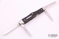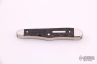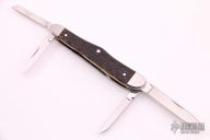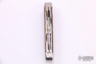 This 4-Blade Swell Center by Ryuichi Kawamura features hand rub satin finished blades with nail nicks. The handle has stainless steel bolsters, Remington bone covers with stainless steel escutcheon, stainless liners and springs. Has half stop, flush at all positions. Has a couple very light scratches, otherwise excellent condition.