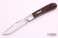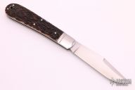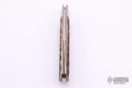 This slipjoint from Hiroaki Ohta features a hand rub satin finished clip point blade with swedge and nail nick. The handle consists of stainless steel fluted bolsters, jigged bone covers with stainless steel escutcheon, steel liners and spring. Has a half-stop, flush in all positions. Has a few very light scratches, otherwise excellent condition.