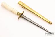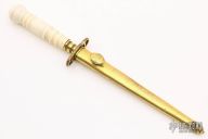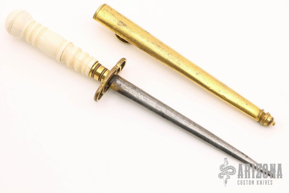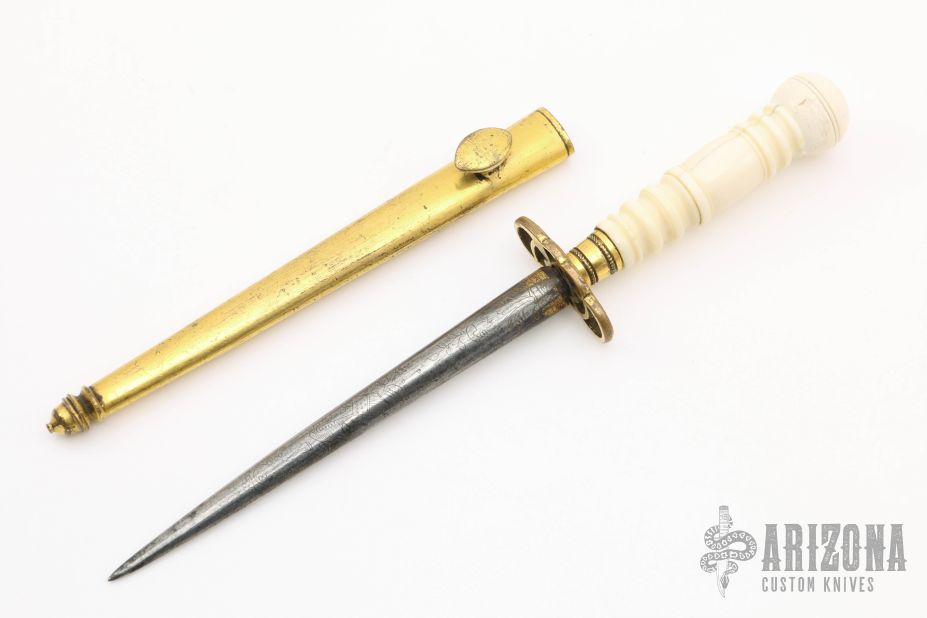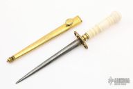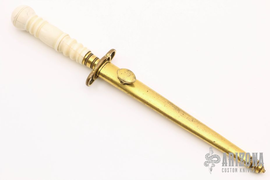 This antique Naval dagger is believed to be from the 1700s. It features an engraved and gold guilded blade with .268" blade stock and .420" blade depth, hidden tang construction. The handle has a brass guard and a fluted ivory grip. Comes with a brass scabbard. Has some patina and scratches, has some cracks in the handle, otherwise good condition for its age.