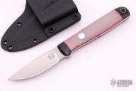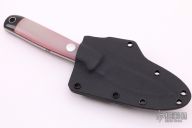 This K-46 Hunter Scalpel by Dozier Knives features a satin finished blade with .129" blade stock and .733" blade depth, full tang construction. The handle has black linen micarta bolsters, front and rear, natural G-10 scales with red liners, black linen micarta liners, aluminum pins and lanyard hole. Comes with kydex sheath with belt clip. New from maker.