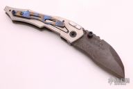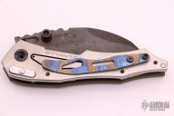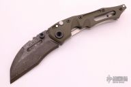 This M250 Cobra M4 from Dwaine Carrillo features a Damascus recurve blade with notched thumbrest and dual thumbstuds. "Iron Rhino" and "CD-250RGB" and "UBOLT" and "M4" milled into the blade. The handle has a milled green G10 "A" side and satin finished titanium lockside, aluminum backspacers, tip up titanium clip that has an anodized pattern. Comes in a padded Pelican case. Excellent condition.