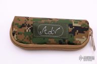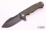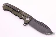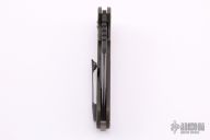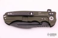 This ADV Harpoon F-17 framelock flipper has a black stonewashed blade with swedge, fullers, notched thumbrest and flipper. Handle has a green coated titanium frame, titanium backspacer and black tip up clip with roller, satin finished hardware. Rides on bearings, nice smooth action, detent, lockup and blade seating. Comes with nylon zippered case. Excellent condition.
