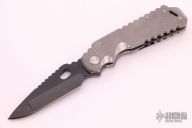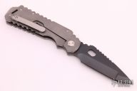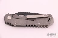 This Arktika from Medford Knife & Tool features a black PVD compound ground blade with notched thumbrest and spine, thumbhole opening, 1/4" blade stock. The handle has a tumbled titanium frame, D2 skull crusher and backspacer, and a tip up titanium clip. Comes with original box and papers. Excellent condition.