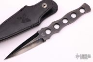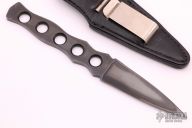 This Skeleton Boot Dagger by Jody Samson features a black chisel ground double edged blade with hollow ground b-side, .185" blade stock and 1.088" blade depth. Comes with a black leather boot sheath. Has a few very fine scratches, otherwise excellent condition. This knife was the predecessor to the Skeleton Boot Dagger by Benchmade.