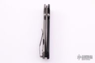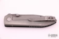 This MK4 by TAD Gear features a tumbled blade with dual thumbs studs and notched thumb rest on blade spine. Has caged bearings. Lockbar/rear scale is bead blasted titanium as is the pocket clip, which is positioned for tip up carry. Front scale is black G-10 with 3 signature TAD/Dauntless grooves. Contoured handle. Has some scuffs/scratches on the frame and blade, otherwise good user condition.