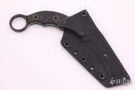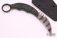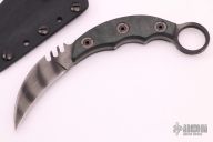 The HS Karambit is a collaboration design with Steve Tarani. Has a tiger striped double-edged hawkbill blade, .189" blade thickness and 1.011" blade depth. Sharpened top edge. Has green G-10 scales. There are light sheath marks on the blade, otherwise excellent condition. Comes with kydex sheath.