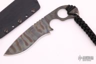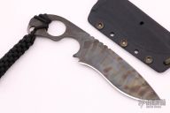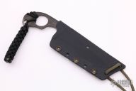 This Rare SLCC by Mick Strider features a flamed Stellite recurve multi-ground blade with sharpened top edge and notched thumbrest, .142" blade stock and 1.623" blade depth, full tang construction. Comes with a kydex sheath. Has some light scuffs, otherwise excellent condition.