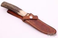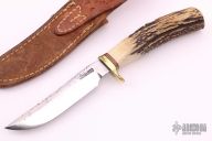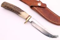 This Model 7-4 by Randall Made Knives features a satin finished blade with false top edge, .168" blade stock and .913" blade depth, hidden tang construction. The handle has a brass guard, stag grip and red/white/blue spacers. Knife comes with a brown leather sheath with belt loop. Has some oxidation on the blade, otherwise good user condition.