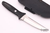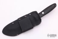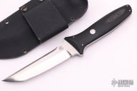 This Tanto by Bob Lum features a hand rub satin finished upswept tanto blade with .217" blade stock and .963" blade depth, full tapered tang construction. The handle has black G-10 scales with stainless pins. Comes with a kydex sheath, but it doesn't have the best fit. Has a small nick in the blade, otherwise excellent condition.