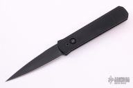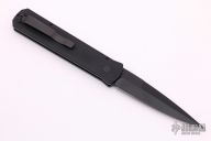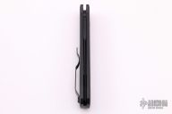 This knife features a black blade with notched thumbrest. The handle has a black aluminum frame with black hardware and black stainless steel tip up clip.  There is a lantern inlaid into the push button.  Comes with original box and papers. New from maker.